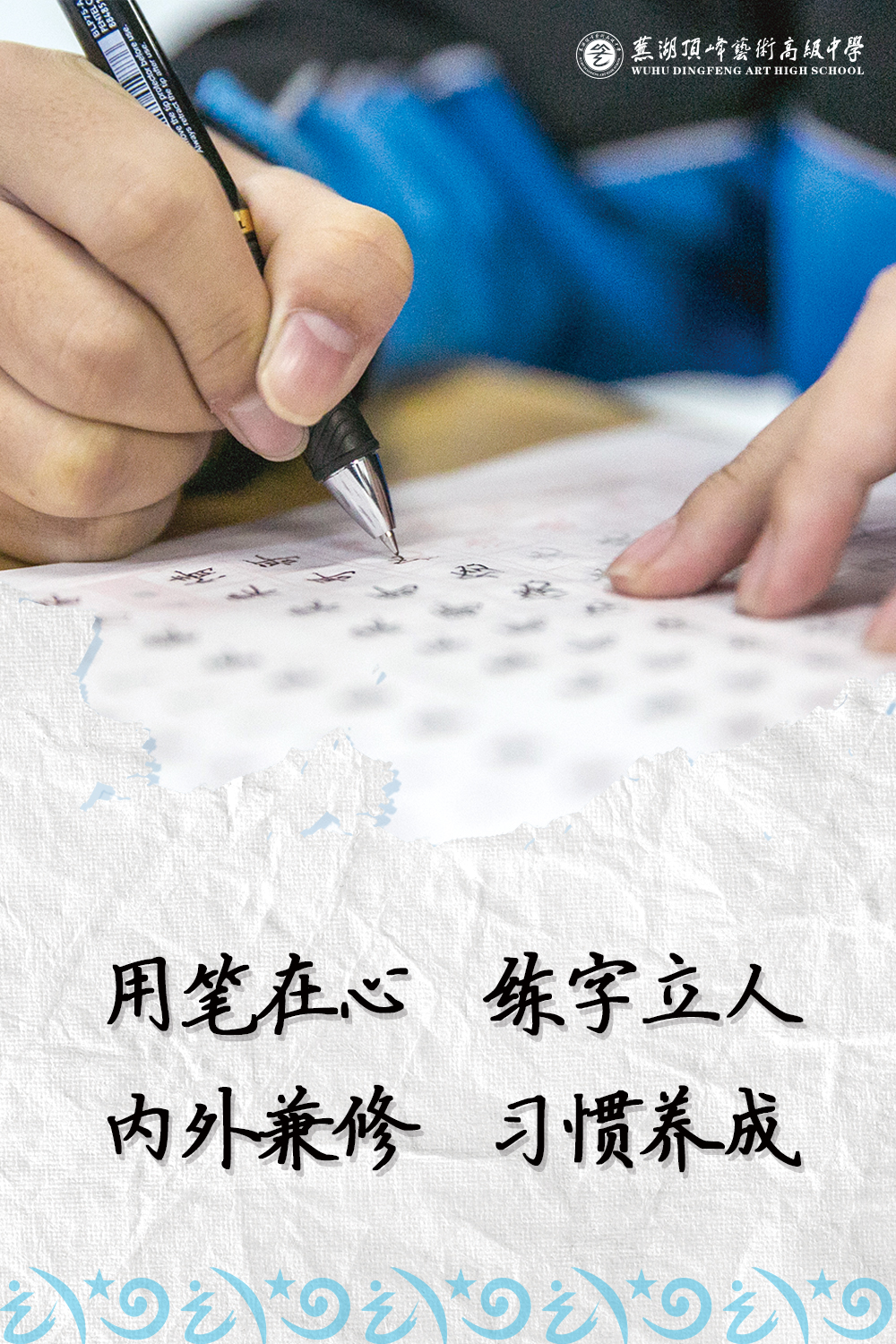 诗以言志,文以载道,汉字留存至今,极具文化底蕴,及艺术审美。书法是素质教育的载体,通过学习书法让孩子养成良好的行为习惯,提升孩子的内在灵魂,奠定深厚的文化基础,让孩子具有极高的艺术修养。同时,写一手漂亮的好字能直接为以后的高考提升卷面分,是取得高考成功的一大因素。 顶峰艺术高级中学将传统文化精髓与教育教学工作深度融合,培养学生每日练字的好习惯,让同学们徜徉在笔墨的芬芳里,陶醉于自我提升的快乐中,每天的收获不止是练字后的所得,更多的是润物细无声的习惯培养,“养成教育”,从芜湖顶峰艺术高级中学开始。 让我们一起来看看顶峰的同学们 是如何一笔一划书写“顶峰时光”的吧 WRITING 见字如见人,字正人亦正 / 书法是一项十分精细的活动 要想把字写好 须得全神贯注,凝神静气 并要脑、眼、手相应 准确控制运笔的轻重缓急 这样久而久之就能潜移默化地 改变一个人的心理素质 历练意志,磨砺心理 养成细心、镇静的习惯 WRITING / WRITING 一手好字,受益终身 / DINGFENG / ✍🏻✍🏻✍🏻