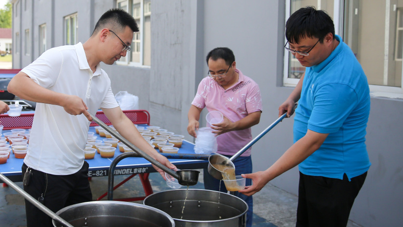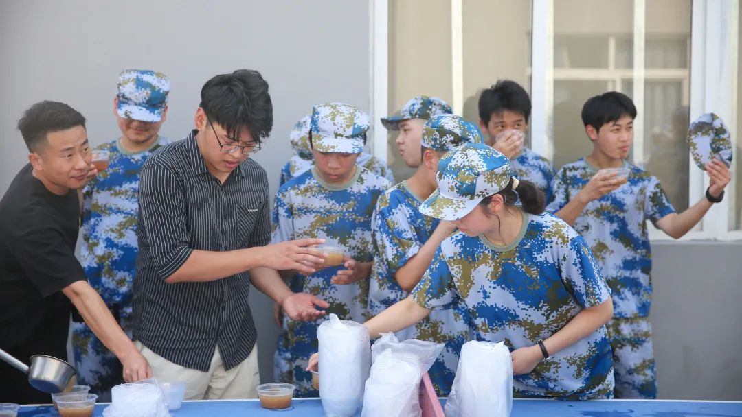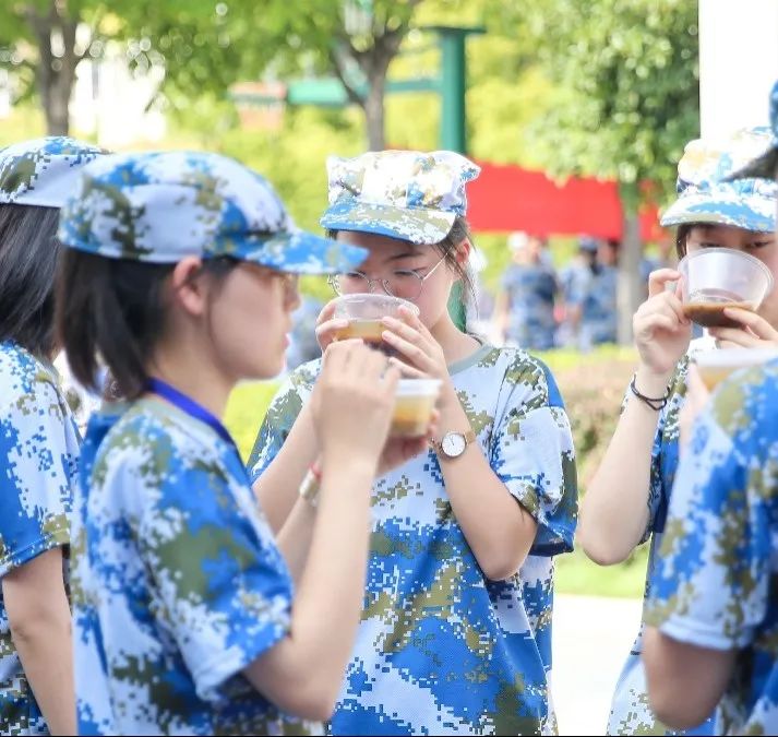 虽然天气并不十分炎热,但孩子的状态我们也时刻记挂在心上。为了缓解军训时孩子们的疲惫,学校给大家熬煮了清凉清甜的绿豆汤。轻松的休憩时刻,让大家感受到了欢乐,绽开了笑容。