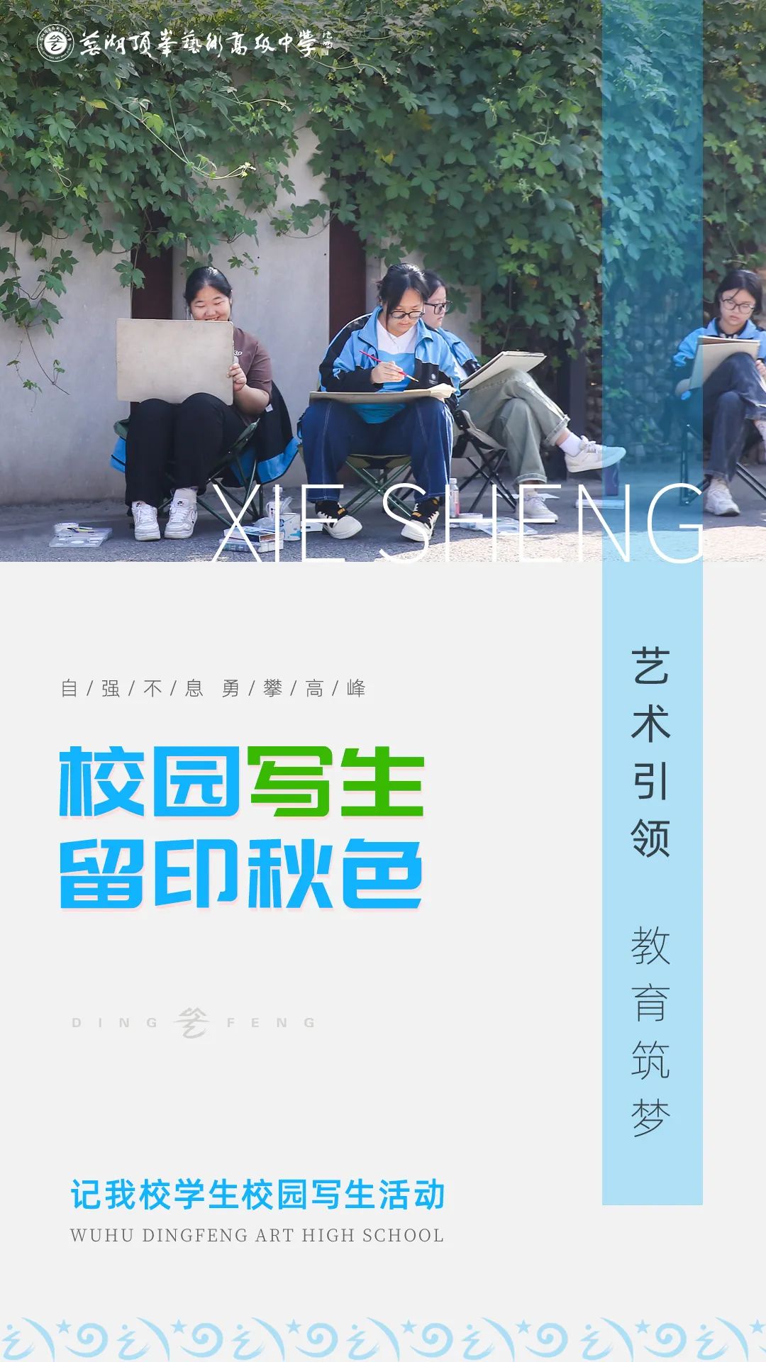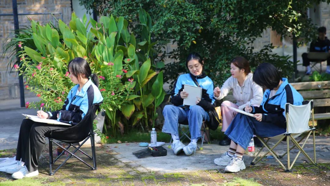 灵感演绎精彩,艺术滋养人生。 10月12日, 我校的学子们走出教室,迈向校园, 开展了校园写生活动。 同学们在和煦的阳光下亲近自然, 临摹校园之美, 捕捉诗意秋景, 感受艺术乐趣。 漫步顶峰校园 一砖一瓦皆是艺术 一花一木皆是风景 顶峰学子们 用一双双专注的眼睛 亲近自然、观察自然 捕捉校园中蕴藏的色彩美 绘心中美景,写秋日风物