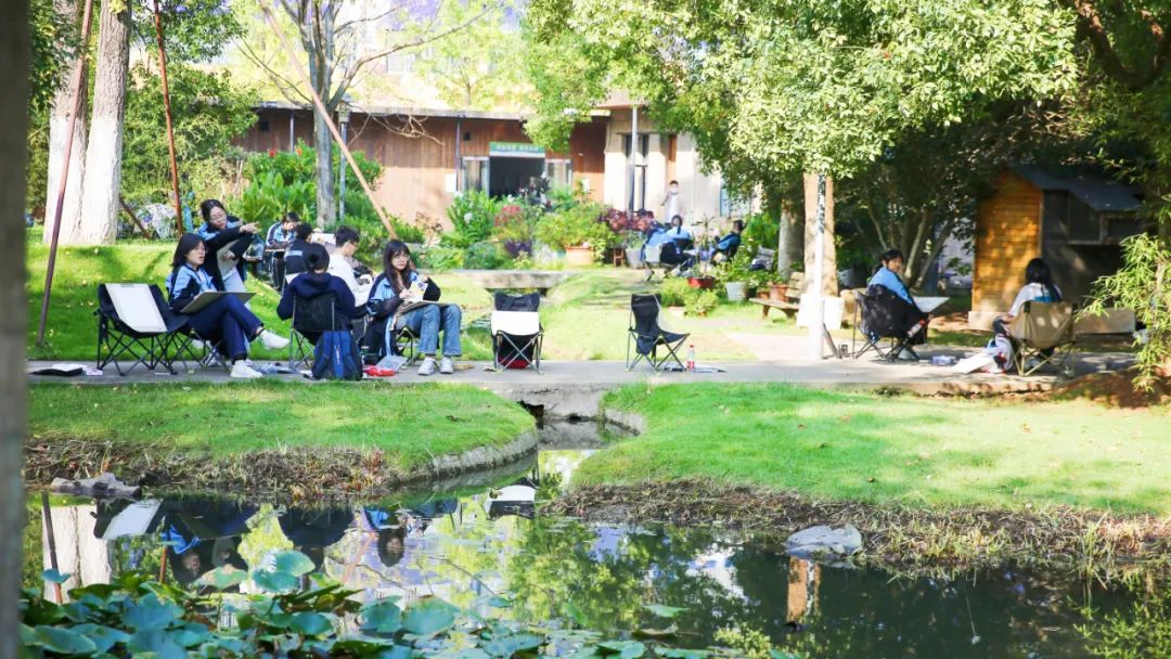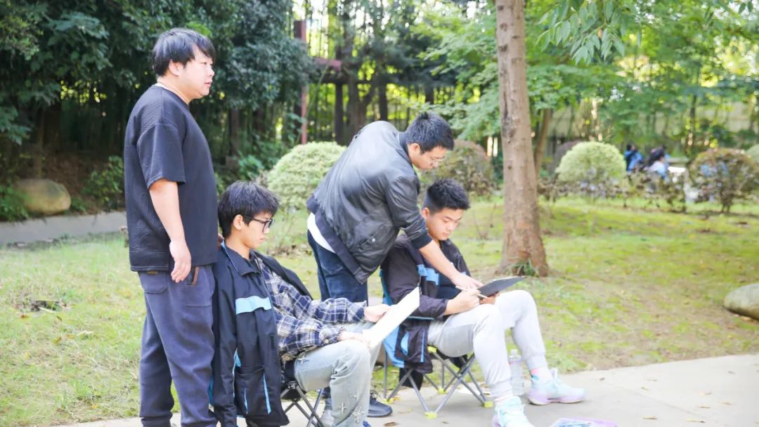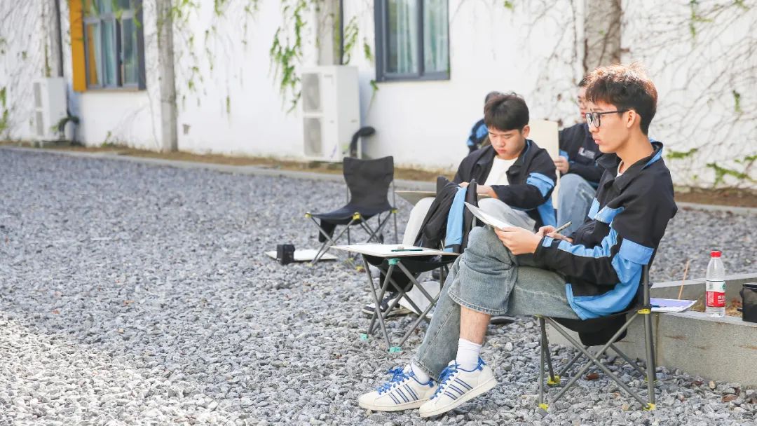 同学们在选好最佳观景位置后 或席地而坐、或站立静思 或于绿树下、或于花草旁 一笔一画,轻拥秋色 循着光影,运笔布局 用心描摹校园最美之风景 专业教师现场指导学生构图、调色 启发学生对色彩的感知和把握 逐步提升审美及表现能力