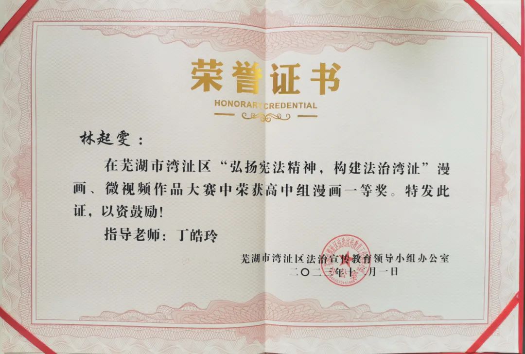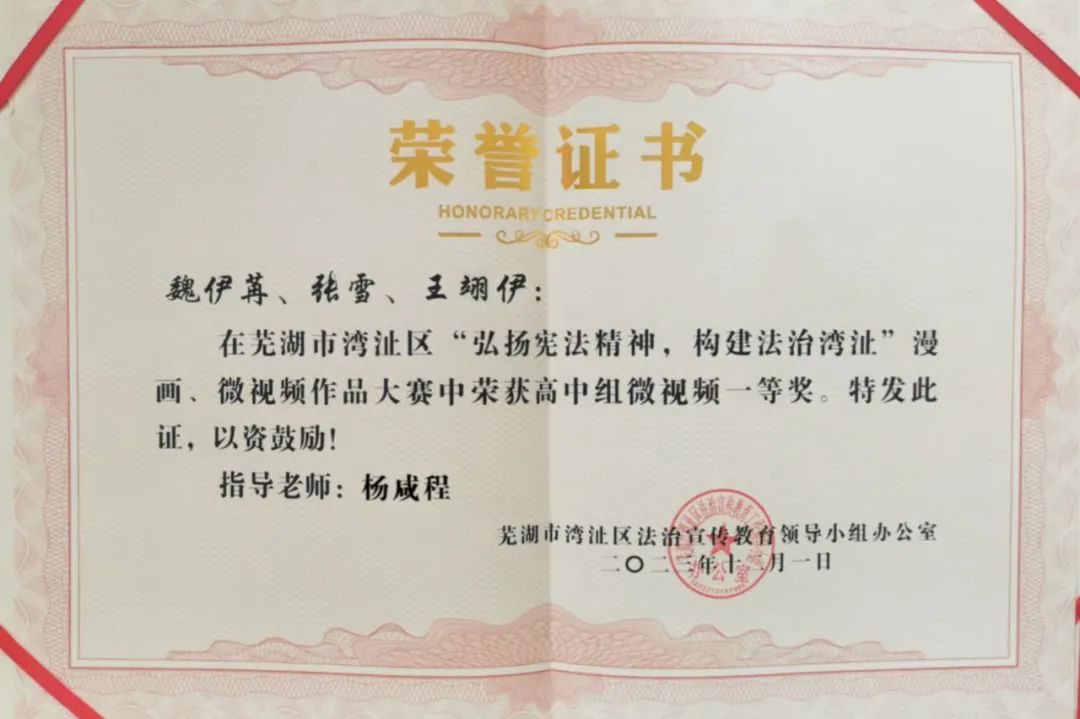 热烈祝贺我校学子在湾沚区 “弘扬宪法精神 构建法治湾沚”主题大赛中 分别荣获高中组漫画、微视频一等奖 高中组漫画一等奖 获奖学生:林起雯 指导老师:丁皓玲 高中组微视频一等奖 获奖学生:魏伊苒、张雪、王翊伊 指导老师:杨咸程