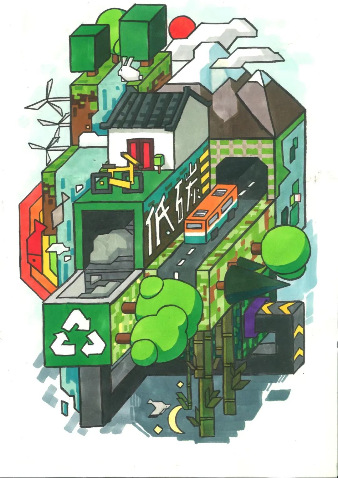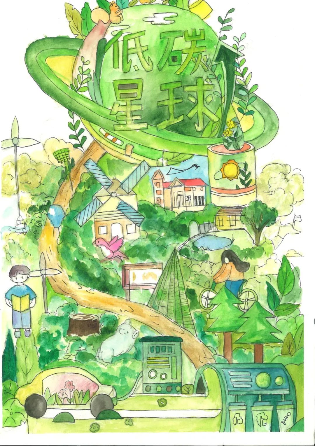 践行双碳精神,赋能绿色发展。我校学子的美术创作传播绿色环保发展理念,美丽画卷传递节能减碳意识。借此活动,希望同学们能积极做绿色低碳的宣传者、践行者、推动者,为环保助力,一起开启“绿色”未来!