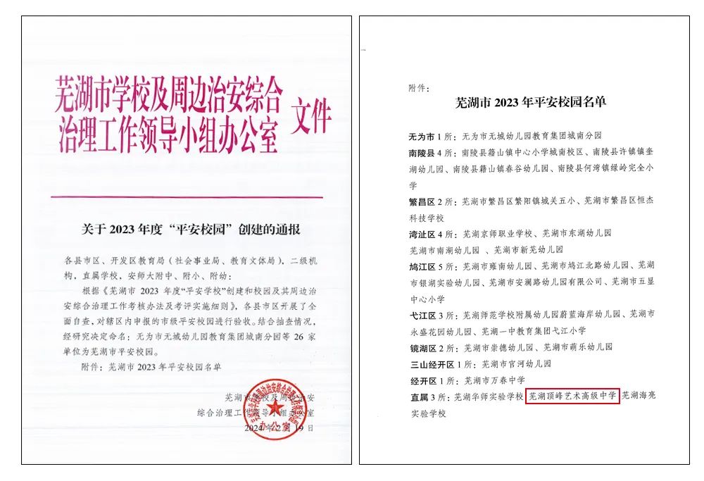 近日,芜湖市教育局发布《关于2023年度“平安校园”创建的通报》,我校全面通过“平安校园建设”评估验收,被授予2023芜湖市“平安校园”称号。 我校始终将学生安全放在第一位,高度重视校园安全管理工作,坚决贯彻落实上级有关文件精神,以建设平安校园为抓手,在全体教职员工的共同努力下,建立建全校内外安全防范机制、完善完备安全制度及应急预案、配齐配足安防设施、做实做细安全演练及安全排查、严肃严格卫生保健,营造良好安全的校园学习环境,深化平安校园建设。 顶峰坚持把校园安全视为发展的“生命线”,并全力落实常态化、长效化校园安全保障工作:开展校园安全隐患排查工作,开展校警巡逻、监控无死角监控排查活动;组织德育、班主任、生活班主任、学生安全委员安全会议;深入开设师生安全、法治及心理健康教育课程,开展各项安全预防和演练活动,将安全教育融入到一日常规,加强师生的安全知识教育。 此次获评“平安校园”荣誉称号,是对学校安全稳定工作的高度肯定和充分认可,但安全工作只有起点,没有终点。学校将努力巩固平安校园建设现有成果,凝聚安全教育合力,进一步完善安全工作机制,提高防范和应对各类安全事件的能力,为顶峰师生创造更加安全、稳定的校园环境。