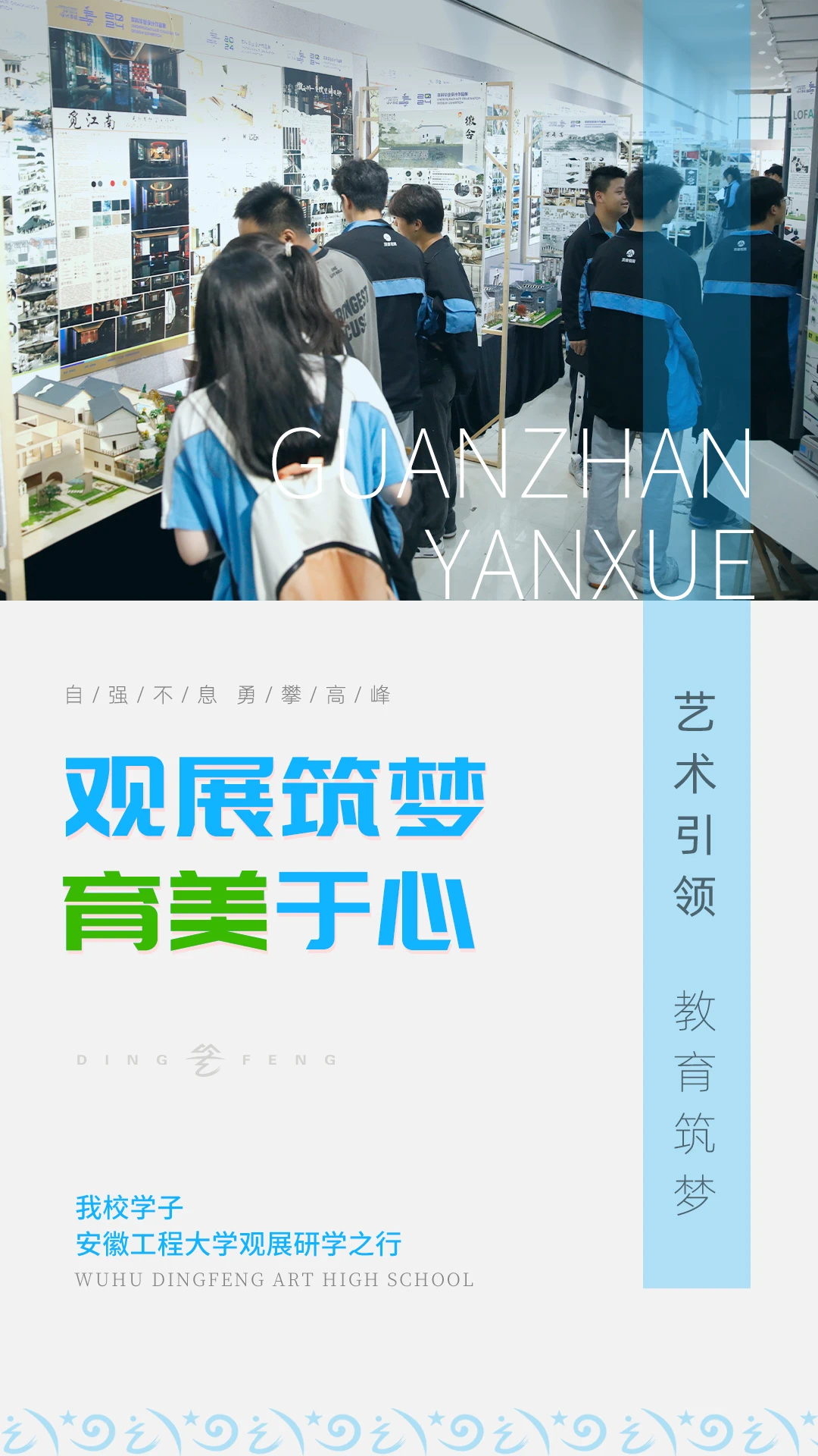 美育润心,美育实践更有着独特不可替代的作用。芜湖顶峰艺术高中注重寓美于教、融美于学、以美育人,竭力与社会优质艺术资源进行链接,让顶峰艺术学子行走在美育课堂间,涵养美学意识,汲取不竭的灵感与力量,让经历变成更好的学习过程。优质的课堂,不止于教室,让课堂行走,让教育延伸。5月27日,顶峰艺术高级中学师生一行走进安徽工程大学设计学院,观看其2024届毕业设计作品展,开启了一场收获颇丰的观展研学之旅!置身艺术空间