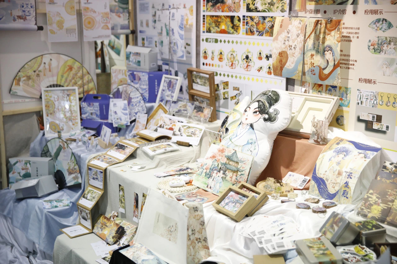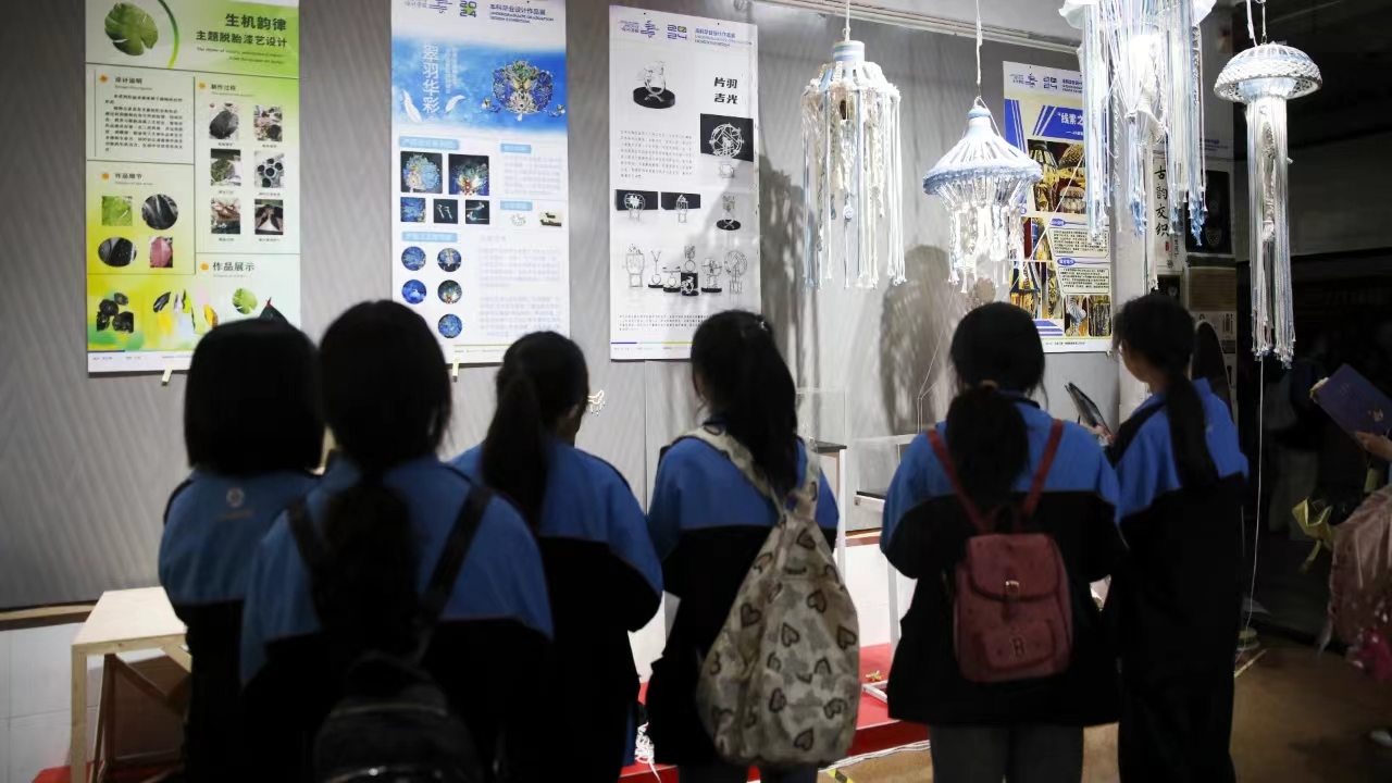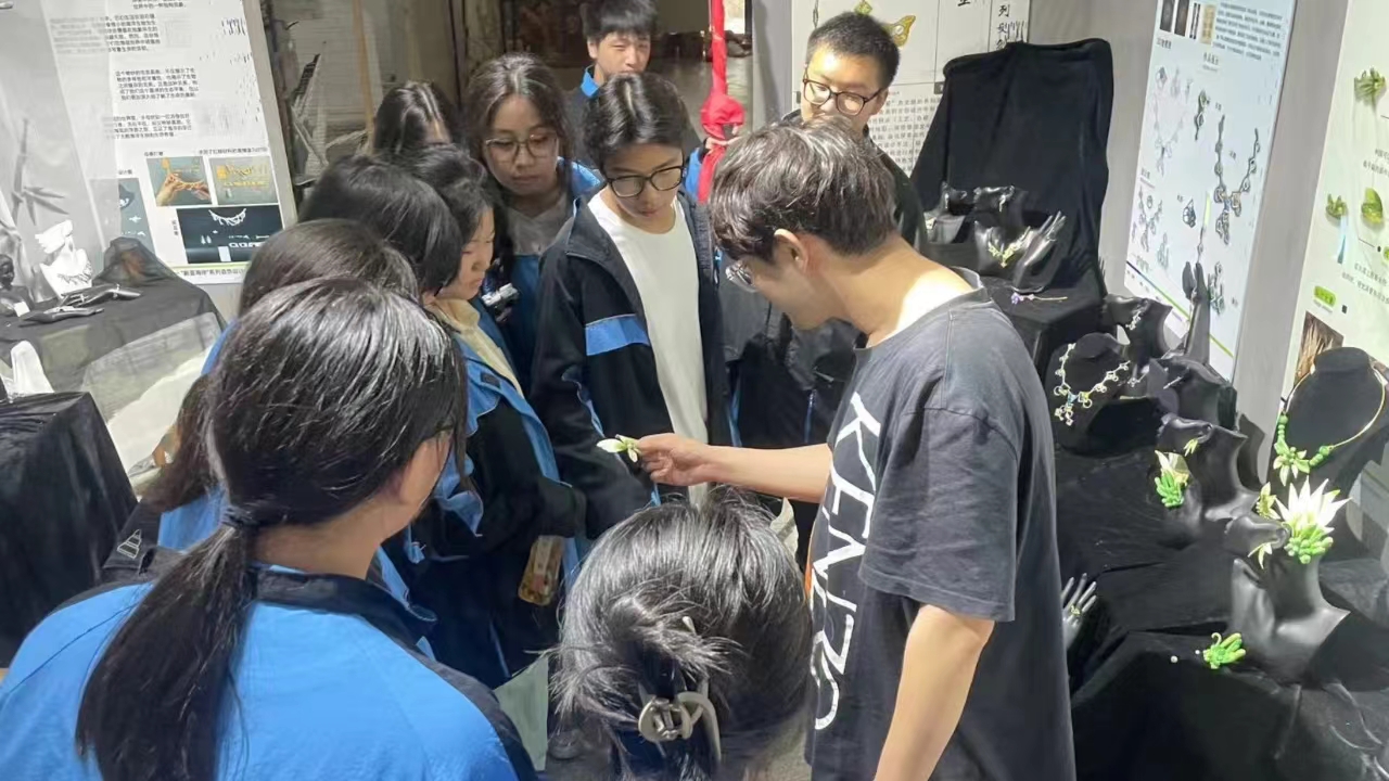 同学们专注地欣赏着创作成果,并与创作者们积极互动,倾听他们对作品的形式、材料、画面等细节的专业讲解,以最直接的方式探秘作品设计的灵感来源。
