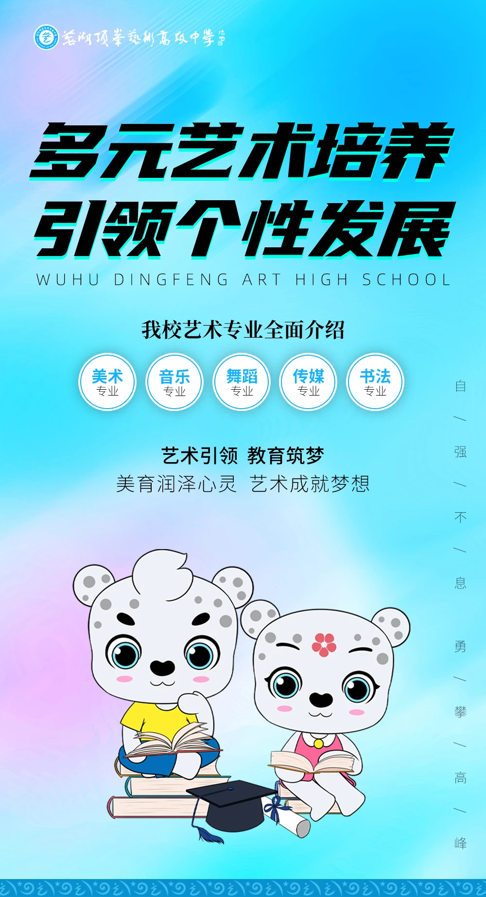 我校舞蹈专业开设课程有中国舞、国际标准舞等舞种,汇聚全国舞蹈教育资源,配有专业的教学团队,均毕业于舞蹈类专业院校,自身专业素质过硬,具有丰富的舞蹈艺考教学经验,帮助孩子放飞舞蹈梦想,成就美好未来。 培养目标:以舞育美、融合育人,培养高素养高技能的舞蹈人才。 课程设置:国家必修课程+舞蹈基本功、剧目、即兴表演选修课程。 师资配置:文化课由骨干教师任教,专业课由具有十年以上教学经验的优秀老师任教。 升学方向:冲刺国内顶尖舞蹈学院及舞蹈类本科院校。 多年的砥砺耕耘,我校传媒专业拥有雄厚的师资力量,特聘资深教授、历年考官、电视台老师担任教学指导,拥有一支教学经验丰富的优秀专业教师队伍,实施针对性的培优辅差方案,让每一位学生得到充分发展,培育出多位省统考高名次学生。 培养目标:知行合一、德才兼备,致力于培养复合型传媒人才。 课程设置:国家必修课程+播音主持、影视表演、导演、服装表演等专业课程。 师资配置:文化课由骨干教师任教,专业课由具有十年以上教学经验的优秀老师任教。 升学方向:冲刺国内顶尖传媒类院校及传媒类本科院校。 书法专业紧跟全国高校书法专业应试动向,精准把握考学方向,为每位学生量身制定详细学习计划,真正做到一对一、手把手教学,让学生在最短的时间内迅速提高专业水平能力,为全国各个高等艺术学院输送了大批的书法专业人才。同时精心打造高品位书香校园,以书法育人、以作品感人、以书香动人。 培养目标:书香少年,德艺双馨,培养高素质有内涵的书法人才。 课程设置:国家必修课程+书法创作与书法临摹(楷、隶、行)课程。 师资配置:文化课由骨干教师任教,专业课由具有十年以上教学经验的优秀老师任教。 升学方向:冲刺国内九大美院及综合本科院校。 秉承多元发展的育人理念 以专业的师资力量 优越的硬件设施 丰富的特色活动 发现学生优势,启发学生天赋 全方位激发潜能,叩响梦想大门 芜湖顶峰艺术高中