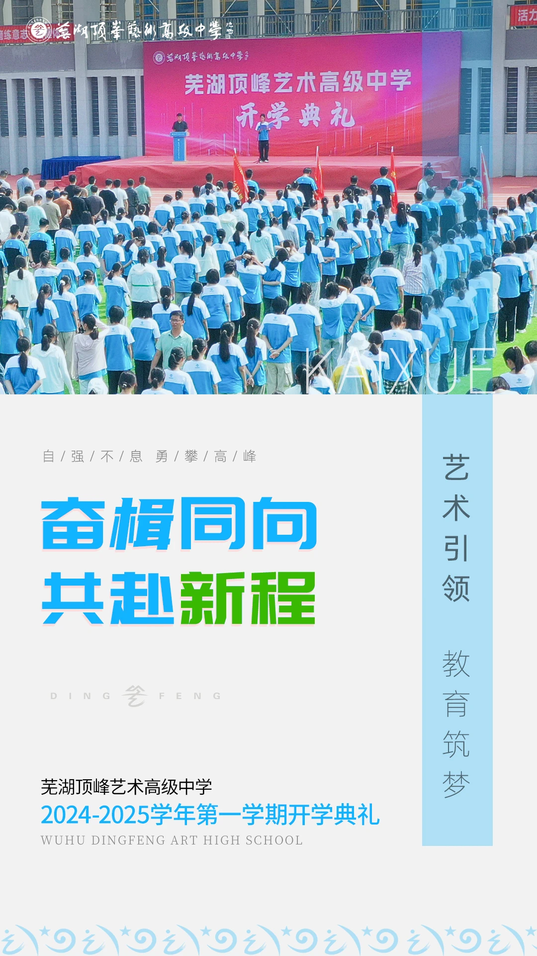 金秋开学季,学子逐梦时,同学们站在全新的起点上,满怀期待与憧憬,迎来了充满挑战与机遇的新学年。带着新的目标、新的梦想,芜湖顶峰艺术高级中学于9月1日至2日,组织了开学典礼及一系列新生开学活动,共同翻开新学期崭新的第一页。