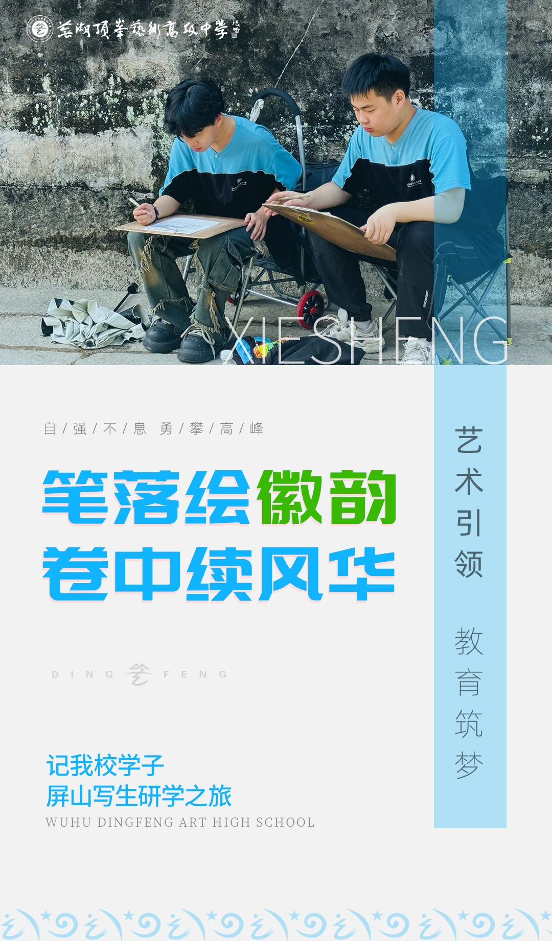 随着艺考改革,风景题材将广泛地出现在联考、校考、美院考试中,在色彩和速写教学体系中比重增大,所以风景在美术学习中变得至关重要,而走进户外亲身感受真实的自然场景,是练好风景的有效途径。 对于高三生来说,外出写生这门必修课不仅能让学生快速掌握风景色彩与速写写生的实战技巧,实现理论与实践的有效交融;更能让学生从容应对多变的美术高考试题,引导其深入生活对多重场景中的艺术之美进行感知、发掘和表现,拓宽学生的取材思维和艺术走向。 对此,此次屏山写生我们安排专业教师,对色彩风景和速写创作进行针对性教学。接下来让我们用一篇文章的时间,走进同学们笔下的山水世界。 PART.01 赴梦 · 秋遇屏山 探秘徽韵