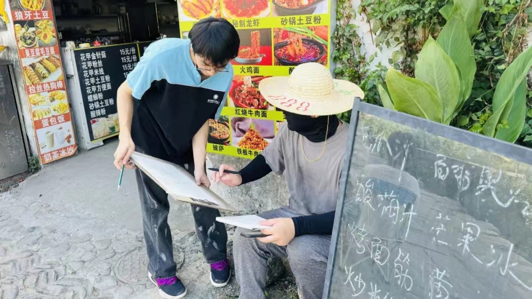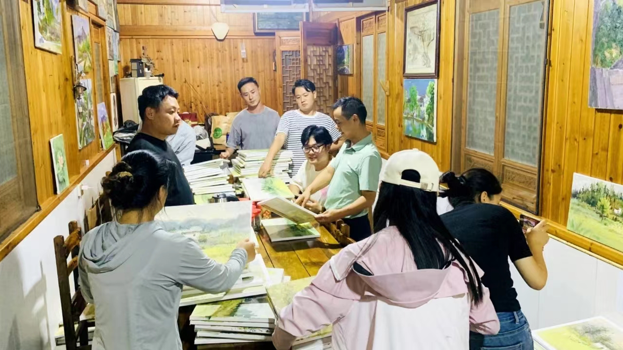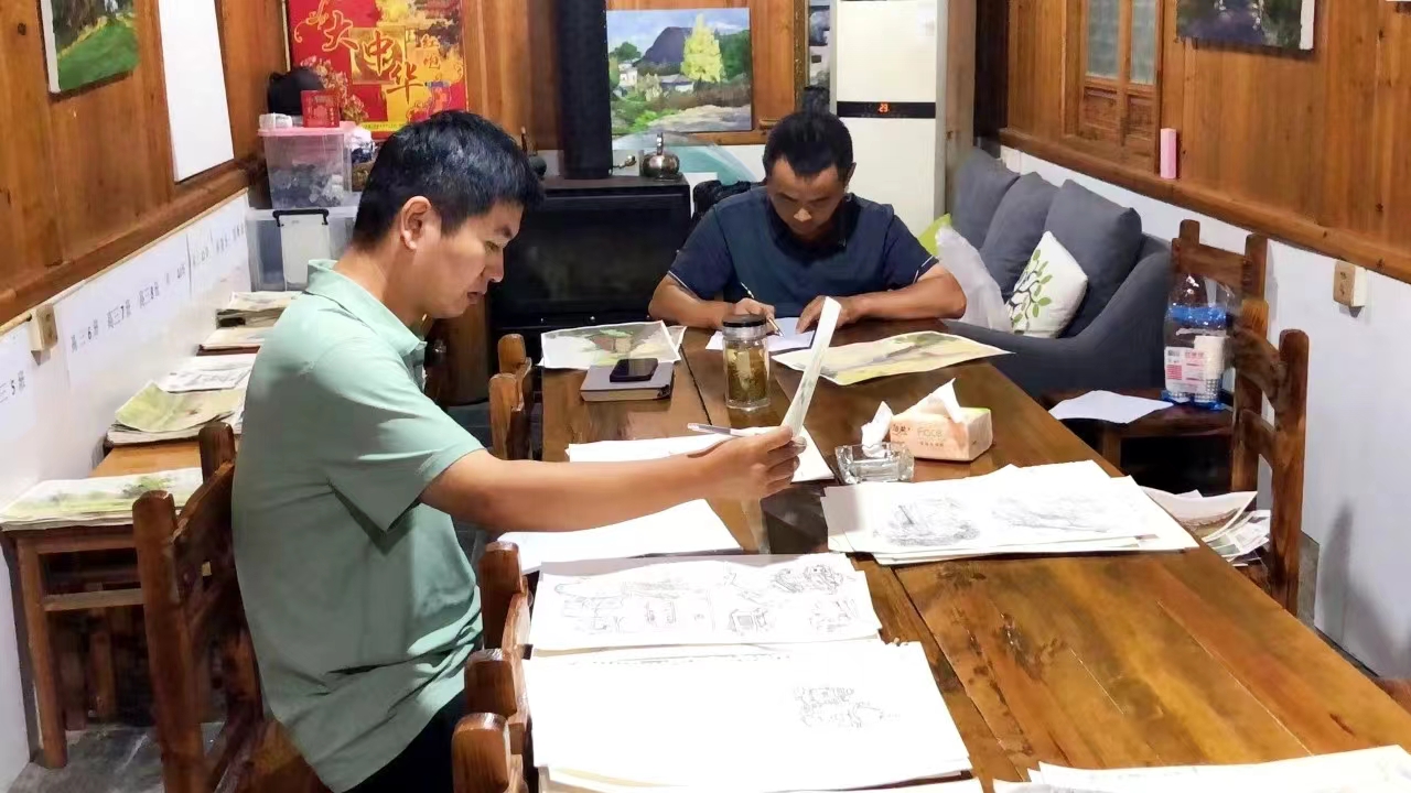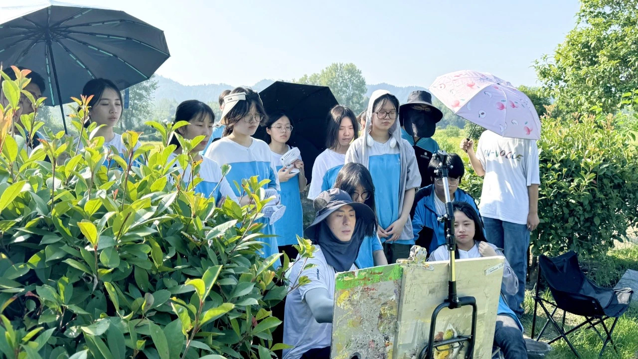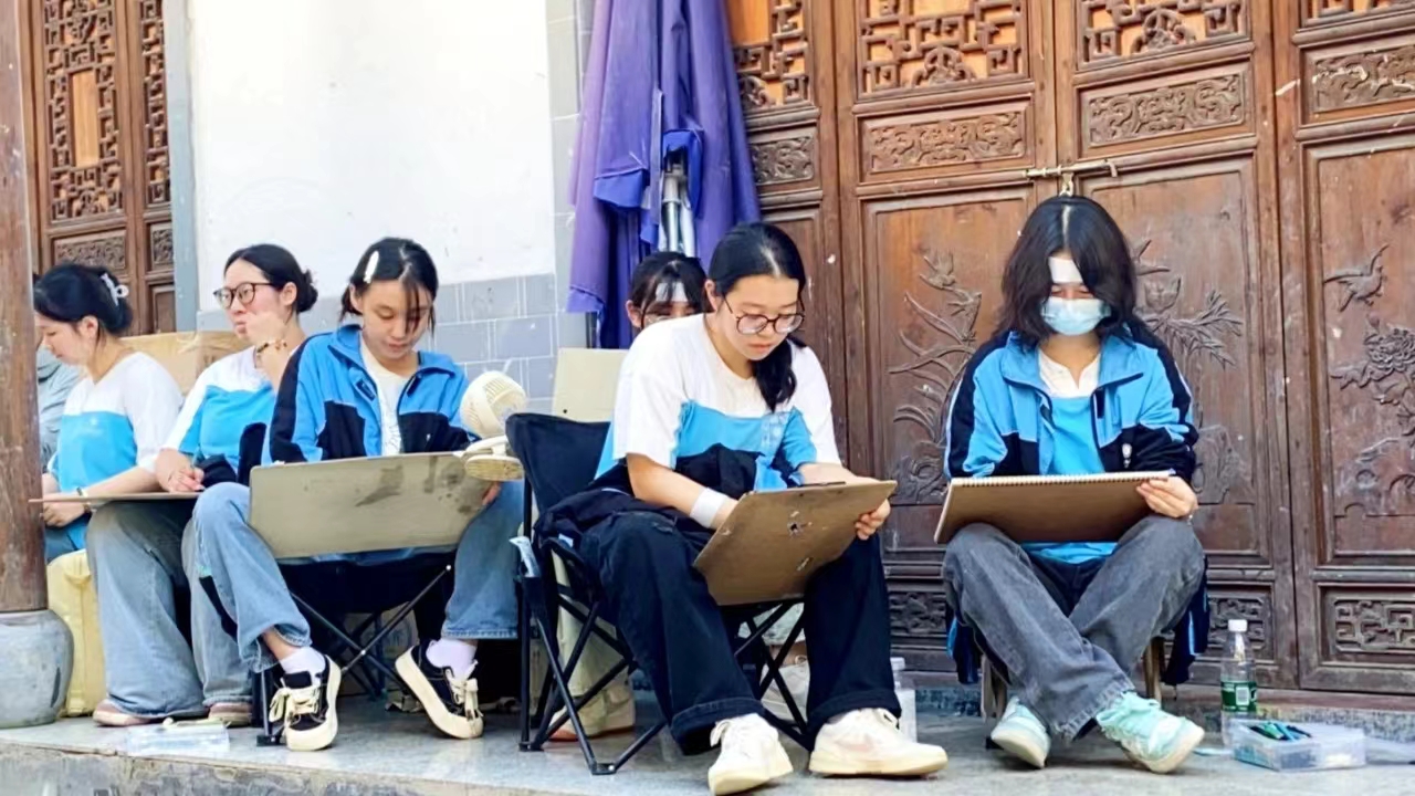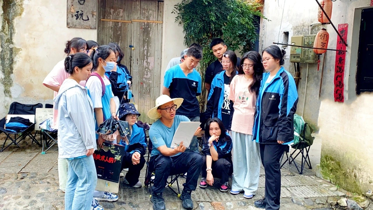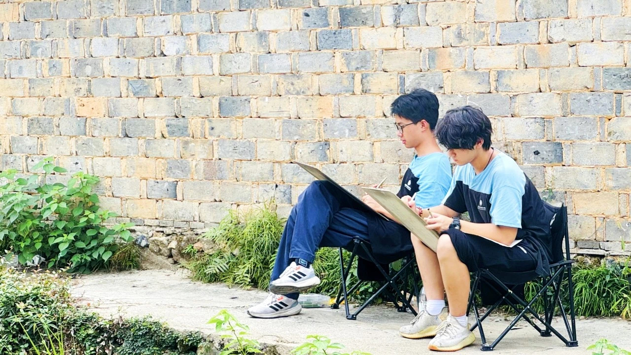 徜徉于屏山的云雾青山间,流连于古村的皖南民居里,这一次,走出课堂,同学们将身心寄于美丽的乡村和山水之间;这一次,拿起画笔,在这绮丽的皖南风光中汲取灵感。 PART.02 追梦 · 步履不停 创作不止 沿着穿乡小路,背对古朴巷道,写生小分队总是一坐一整天,倾其心而投其身的写生创作:绘山间物、 追林荫光、寻溪涧色,凝聚成独属于自己的屏山印象。纸笔相接,每一次挥洒都是与自然的对话;磨练技艺,不断地用笔触丰富自己的画面。