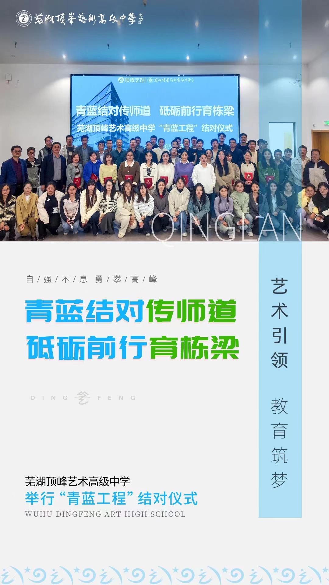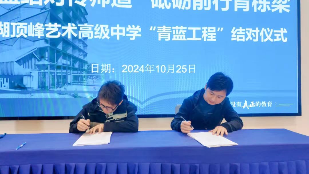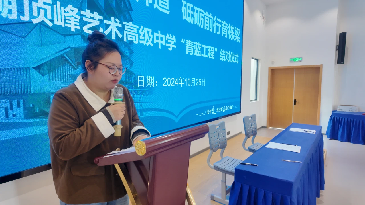 为进一步加强学校队伍建设,充分发挥骨干教师“传帮带”的模范与辐射作用,我校在深入开展教学教研活动的基础上,实施以促进青年教师专业化成长为目标的“青蓝工程”。10月25日上午,芜湖顶峰艺术高级中学举行2024年“青蓝工程”结对仪式,学校班子成员,师徒结对教师参加活动。 1✦解读方案,共担使命✦ 教研室主任徐良华对青蓝工程结对方案进行解读,并详细指出结对的目标、要求、职责、考核办法等。他表示这一协议旨在通过师徒结对的方式,让经验丰富的骨干教师与充满活力的青年教师携手共进,传承教育教学的智慧与经验,从而更好地保证班级管理高质量、学校文化高度传承以及教师团队交流良好发展。 2✦领导致辞,殷切期望✦ 查付平作为校领导代表为此次“青蓝工程”活动致辞。他强调青蓝工程旨在顺应学校发展趋势,助力新任教师迅速且高效地融入学校高质量发展轨道,希望我校教师能够依托“青蓝工程”这个平台,做到教学相长,共同提升教学能力,实现教师队伍的整体提升,促进我校教育事业的蓬勃发展。 3✦代表发言,共话成长✦ 以身垂范,青蓝相生。魏雪老师作为师傅代表发表讲话,她表示,身为师傅必定做到师德师能上率先垂范,认真履行师徒结对协议中的职责,毫无保留地力促青年教师成长,共同探索教育的无限可能。 芳华初绽,履践致远。陶雨婷老师作为徒弟代表表达了对学校给予本次宝贵学习机会的感激,对师傅愿意真心以待、倾囊相助的感谢,以及对自身成长的期待。作为一名青年教师,更要时刻保持学习和进步的态度,努力提升自己的专业素养、教学技法和师德师能,为学生的成长和学校的发展贡献自己的力量。 4✦师徒签约,携手共进✦ 在庄重的氛围中,师徒双方认真阅读结对协议,并郑重地签下自己的名字。这一刻,不仅意味着师徒关系的正式确立,更象征着一种责任和使命的传承。未来,他们将在教育教学的道路上携手前行,共同探索,共同成长。 5✦颁发聘书,肩负重任✦ 学校领导为师傅颁发聘书,正式聘任他们为指导教师。这一纸聘书,不仅是对骨干教师们教学能力的认可,更是一份沉甸甸的责任。师傅们接过聘书,也接过了培养青年教师的重任,他们将倾囊相授,助力青年教师成长。 青蓝相遇,共同奋进,彼此滋养。 青蓝携手,传递智慧,传递经验。 这是一场成长的双向奔赴, 更是一片桃李绽芳华的美好愿景。 / 在“青蓝工程”引领下, 我们全体教师将携手并进, 以敬意、热情与责任, 共同谱写教育的华美篇章!