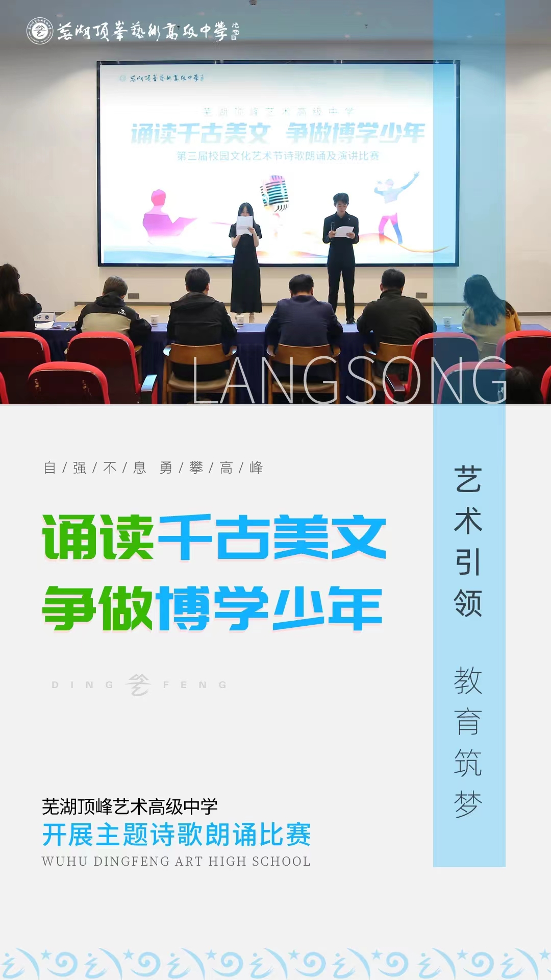 读青春,朗中华;乘壮志,续华章。文明长河奔流不息,经典诗文薪火相传。 为丰富课余文化生活,加强书香校园文化建设,展示我校学生阳光积极的精神风貌,用优秀的校园文化活动激励学生健康成长,我校于10月25日举办了“诵读千古美文,争做博学少年”的主题朗诵比赛,作为本届校园文化艺术节的活动之一,这既是一场文化传承之旅,更是一次深刻的爱国主义教育。 让琅琅书声充盈校园的每一个角落 让爱国的情怀在心中涤荡 是开赛前对同学们寄予的深厚期盼 参赛选手们也精选了具有代表性的作品 在一首首美文、诗作中 23组参赛选手化身为“诗的使者” 以真挚的情感演绎经典诗篇的厚重底蕴 以激昂的语调展现青春中国的蓬勃力量 篇篇诗文在同学们的声声诵读中 台上台下共同沉浸于朗诵之美 让诗行里抒发深沉炽热的爱国情怀 在内心中悄然生根 获奖的同学们收获了荣誉与肯定 而更多的同学则收获了宝贵的经验与成长 但青春的乐章反而更加激昂