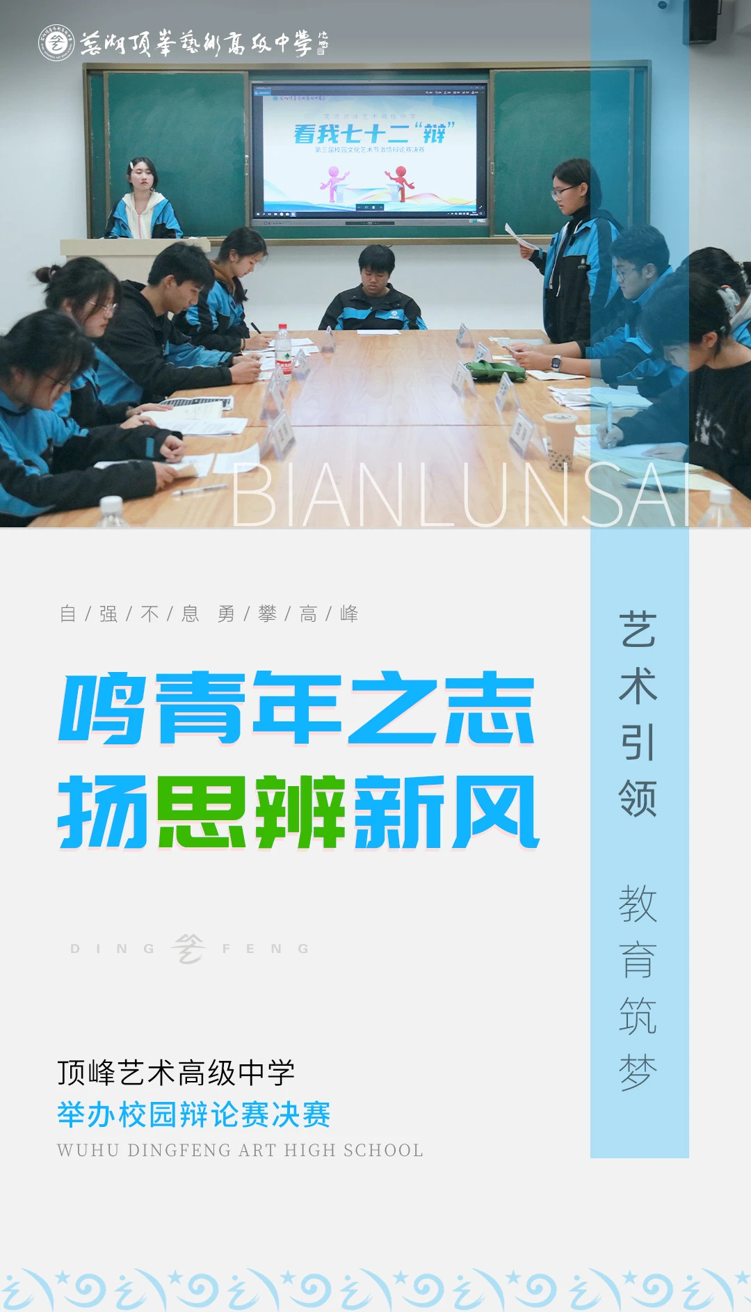 校园辩论赛是学校多样化办学的重要元素,是契合创新型人才培养的重要载体,为学子们搭建了一个展现自我才华和青春活力的平台,鼓励他们“学真知,明是非,善思辨”;更能凝聚团队力量、激发同学们在实践中感受合作团结、竞争对抗的力量。 作为校园文化艺术节系列活动之一,10月28日我校再次掀起智辩风云,举办校园辩论赛决赛。四支队伍,四场对决,他们在思的天地里驰骋,在辩的海洋中乘风破浪。 经过充分的准备,双方辩手们登上舞台,分持“青年应干一行爱一行”和“青年应爱一行干一行”的观点进行智慧较量,展现的是四个人的团队合作,也是八个人的思维碰撞,辩论的火花愈发激烈,青年的风采得以展现。 01/思维碰撞 寻求真知 辩论赛场,永远是智慧与激情的交汇点 双方选手字字珠玑、思路清晰 在开篇立论环节观点鲜明,言辞有理有据 在质询环节步步紧逼,反驳对答铿锵有力 他们围绕辩题你来我往 时而引经据典,时而列举实例 在一次次唇枪舌剑交锋中 比赛气氛愈发紧张热烈 友谊第一比赛第二的辩论赛 尽管我们带着对立的观点互相反驳 却在思维博弈中播下真理的种子 02/辩以启智 评而明理 评委老师对各位辩手的表现给予充分肯定 对队伍整体及个人都提出建议 并且希望同学们能够深入思考这一辩题 从自己的内心出发 未来在顶峰的学习和生活中 保持对知识的渴望和对真理的追求 一起期待最后的比赛结果吧~ 在这场语言与思维交锋、智慧和灵魂碰撞的比赛中,顶峰学子的语言表达技巧、思辨能力、团队协作意识得到了锻炼。选手们在赛场上敢于质疑,勇往直前,这正是顶峰精神的集中体现。未来,学校将继续开展丰富多彩的特色活动,为学生的成长成才搭建高质量平台,助力学生综合素质提升。