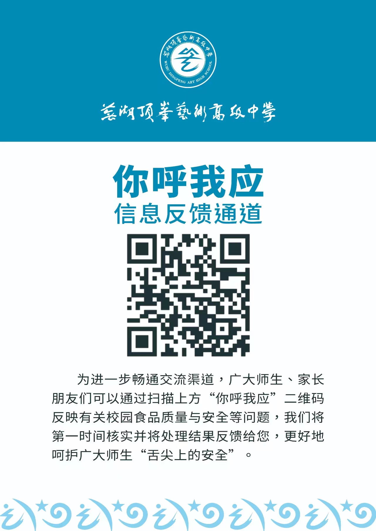 为落实安徽省食品安全委员会办公室、省教育厅、省市场监督管理局联合印发的《学校建立食品安全“你呼我应”工作机制(试行)》文件精神,进一步畅通交流渠道,芜湖顶峰艺术高级中学现建立“你呼我应”机制,及时回应广大师生及家长关于学校食品安全方面的意见和建议,更好地呵护广大师生“舌尖上的安全”,切实增强广大师生的获得感、幸福感和安全感。 01“你呼我应”工作机制 校园食品安全“你呼我应”工作机制是指学校针对广大师生、家长和社会提出的涉及校园食堂食品安全的有关意见、投诉、建议等给予快速响应、高效办理并及时反馈的校园食品安全快速处置机制。学校接到投诉后,第一时间回应。对需要现场处理的,应迅速到达现场,第一时间和投诉人见面或取得联系。相关人员均要做到“你呼我应”,能立即答复的立即答复,不能立即答复的要在做好解释的基础上,告知答复时限,并在要求时限内予以答复。 02“你呼我应”反馈渠道 民以食为天,食以安为先 欢迎家长和社会各界参与学校食堂的监督 共同维护校园食品安全 我们及时响应您的关切 倾听您的声音