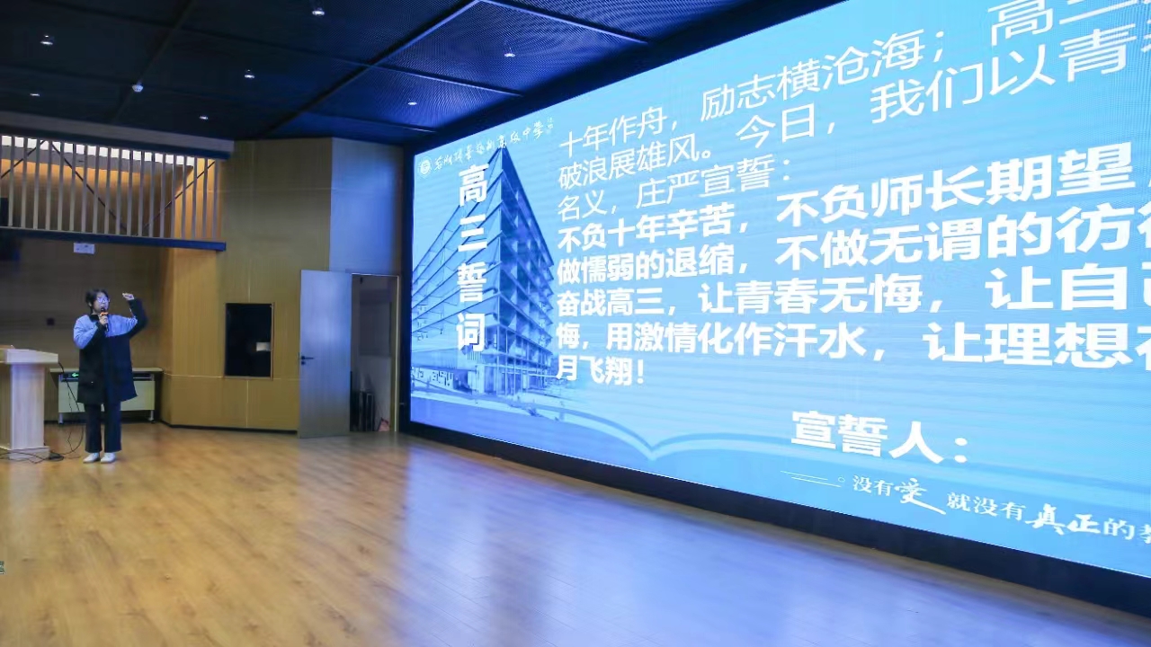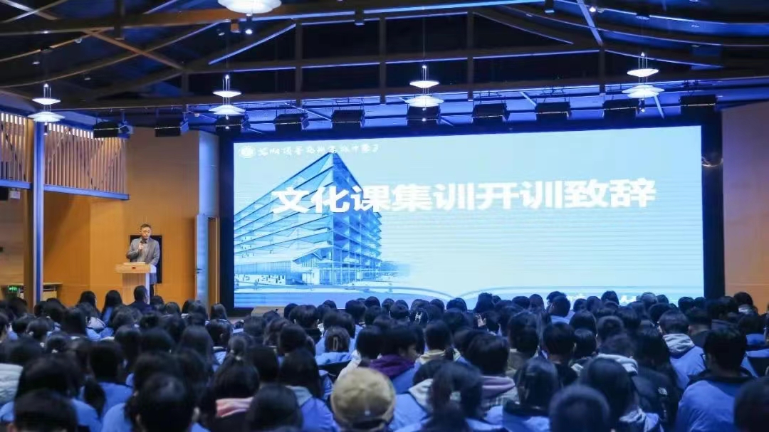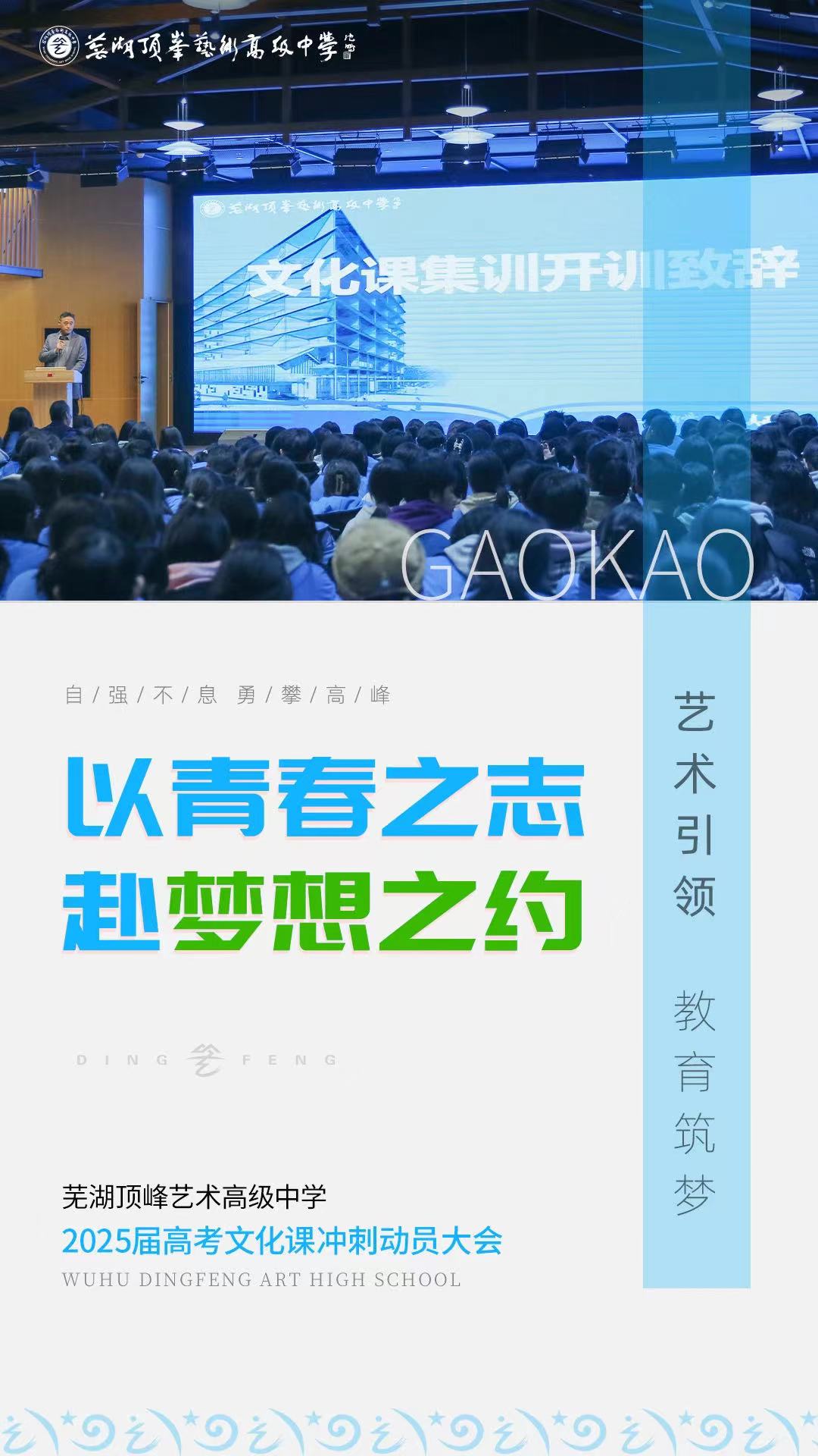 少年当有凌云志,万里长空竞风流 随着艺术省统考逐渐落下帷幕 顶峰高三学子就已怀揣着憧憬与决心 踏上了文化课备考的新征程 为进一步激发他们为梦想而拼搏的斗志 --- 12月4日,我校组织召开一场鼓舞人心的 2025届高考文化课冲刺动员大会 旨为即将全身心投入文化课冲刺的同学们 鼓足干劲、明确方向 助力他们在高考的道路上阔步前行 ▼▼▼ 开训动员 殷切寄语指方向 会上,年级组组长马义永主任针对文化课冲刺期间的日常管理做具体要求,从认识自己、提升自己、成就自己三个方面讲述如何圆梦顶峰! 文化教务处石国主任针对后续教育教学工作安排作总体部署与细致规划,他结合学情实际,指导科学备战方法,为同学们指点迷津、指引方向,增强备考信心。 梦起誓言 青春无畏再出发 “奋战高三,让青春无悔,让自己无悔”,全体顶峰高三学子高举右手庄严宣誓。誓言声声,喊出了他们为梦想奋力一搏的坚定信念,喊出了他们无畏迎接挑战的昂扬斗志。相信未来他们定能在老师们的学业领航与生活护航下,争分夺秒学好文化课,全力以赴备战高考。 此次动员大会 为全体师生吹响了文化课征程的冲锋号 愿同学们不忘来时路、不怠明日行 以更坚定的信念和更顽强的毅力踏上征程 在学校、老师的携手护航下 惜时如金,奋楫逐浪 以更扎实的脚步迈向圆梦的六月