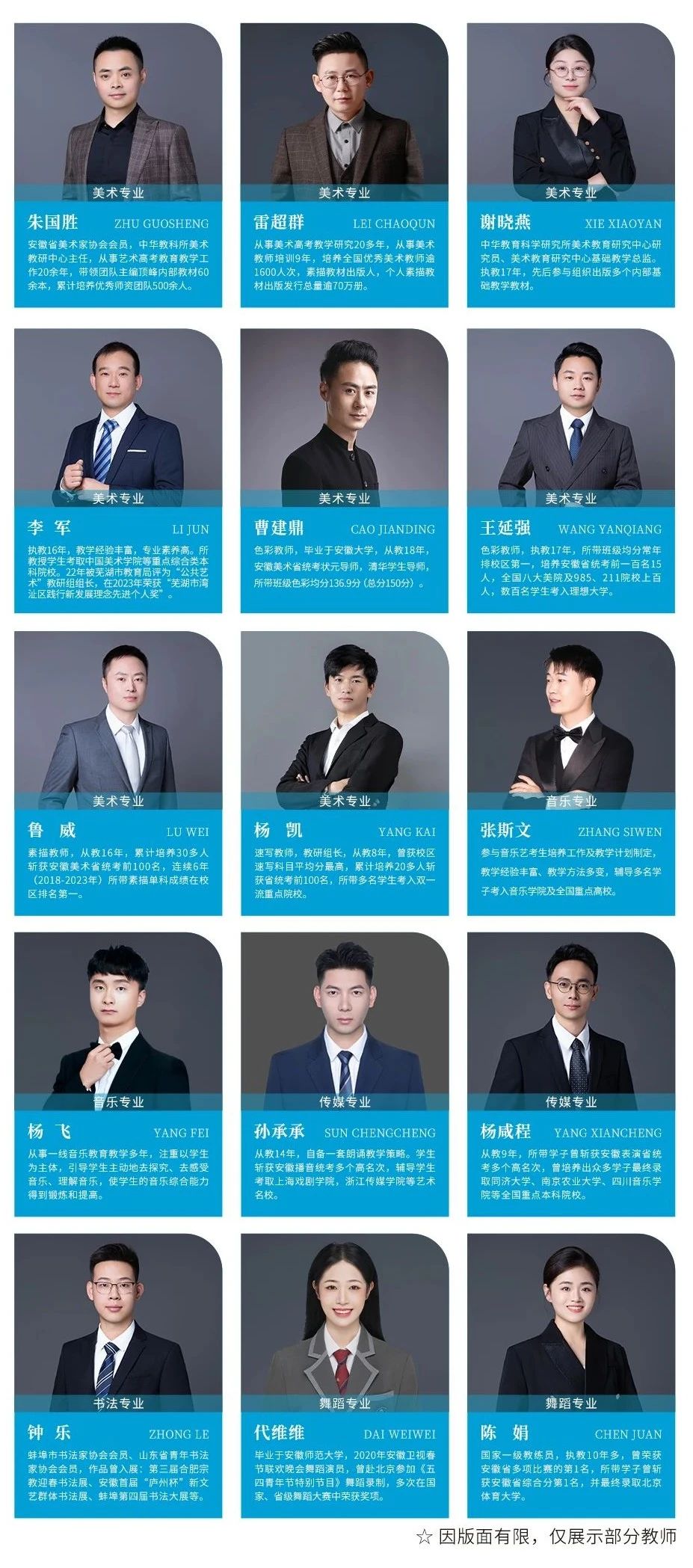 学校依托顶峰艺创集团优质的艺术教育资源,从创建之初,便以艺术立校,艺术教育既是我校办学特色,更是我校的独有优势之一。通过不停地探索、研究艺术高考教育的规律,我校不断累积艺术高考的新经验,在专业教学上,始终保持原创性和前瞻性,逐渐成为引领省内艺术高考教育的风向标。 ▽▽▽ 我校依托顶峰20多年艺术教学资源,从中精选业务精湛,教学成绩突出的教师,优中选优,组建了一支师德与业务俱佳的教学团队,精准规划学生的专业课和文化课,为学生的艺术之路提供全面支持,照亮并指引每个热爱艺术的孩子顺利走进理想高校! 多年的办学积淀,我校艺术类专业成绩优异,连年向中国美术学院、北京体育大学、中央戏剧学院等国内知名艺术类高校及北京师范大学、北京理工大学、东南大学、华东师范大学等双一流综合大学输送了一批批的艺术人才。 2022届顶峰学子罗*婷斩获清华大学校考合格证,最终录取中国美术学院、顶峰学子方*斩获安徽表演专业综合分全省第7名;顶峰学子高*、罗*婷、冯*姿,分别斩获安徽美术专业综合分全省第13名、第26名、第40名。 2023届顶峰学子王*斩获安徽体育舞蹈专业综合分全省第1名;顶峰学子徐*宇、董*欣,分别斩获安徽美术专业综合分全省第18名、第54名;顶峰学子孙*阳、潘*晶,分别斩获安徽表演专业综合分全省第16名、第99名。 2024届顶峰学子方*璇、刘*园,分别斩获中国美术学院校考第54名、第67名。顶峰学子夏*怡、孙*雯分别斩获安徽美术专业综合分全省第23名、第27名。 2025届我校校考成绩优异,共斩获中央美术学院、中国美术学院合格证13张。其中顶峰学子赵*宜分别斩获中央美术学院校考美术学第11名、美术学(中外合作办学)第48名;顶峰学子龚*若斩获中国美术学院校考美术学类造型艺术类第34名。 美术专业依托顶峰艺创集团二十余年深厚的美育积淀,是我校优势专业。拥有一支注重师德师风、深谙美术高考教学的教师队伍。全面实施“高中三年艺术成才规划”,将专业课学习与文化课学习有机结合,遵循艺术规律,实现艺术专业成才。 培养目标:以美育人,心怀梦想,培养具有创新精神的高素质人才。 课程设置:国家必修课程+素描、色彩、速写专业课程+艺术鉴赏选修课程。 师资配置:文化课由骨干教师任教,专业课由具有十年以上教学经验的优秀老师任教。 升学方向:冲刺国内美院及双一流院校、艺术本科院校。 部分出版书籍 我校音乐专业课程汇聚全国优质音乐教育资源,由业内知名导师领航,配备专业的课程顾问,拥有来自各音乐学院毕业的专业教师团队,针对学生的音乐素养、演唱风格、演奏特点、建立个性化的“学生成才培养计划”。 培养目标:激发潜能、乐享成长,培养高素质的专业技能人才。 课程设置:国家必修课程+声乐、器乐、理论(视唱、练耳、乐理)课程。 师资配置:文化课由骨干教师任教,专业课由具有十年以上教学经验老师任教。 升学方向:冲刺国内顶尖音乐学院及音乐类本科院校。 我校现拥有30间独立琴房、五间小课教室、两间乐理教室及一间表演音乐厅,在专业课学习期间既满足学生们场地及表演舞台的需求,硬件设施和配置齐全。安排专业院校毕业的器乐及声乐老师进行一对一授课,在提供系统音乐教育的同时,也为学生提供了丰富的实践机会:歌手大赛,周末剧场、校园艺术节等活动让学生在实践中不断成长、不断进步。 我校舞蹈专业开设课程有中国舞、国际标准舞等舞种,汇聚全国舞蹈教育资源,配有专业的教学团队,均毕业于舞蹈类专业院校,自身专业素质过硬,具有丰富的舞蹈艺考教学经验,帮助孩子放飞舞蹈梦想,成就美好未来。 培养目标:以舞育美、融合育人,培养高素养高技能的舞蹈人才。 课程设置:国家必修课程+舞蹈基本功、剧目、即兴表演选修课程。 师资配置:文化课由骨干教师任教,专业课由具有十年以上教学经验的优秀老师任教。 升学方向:冲刺国内顶尖舞蹈学院及舞蹈类本科院校。 多年的砥砺耕耘,我校传媒专业拥有雄厚的师资力量,特聘资深教授、历年考官、电视台老师担任教学指导,拥有一支教学经验丰富的优秀专业教师队伍,实施针对性的培优辅差方案,让每一位学生得到充分发展,培育出多位省统考高名次学生。 培养目标:知行合一、德才兼备,致力于培养复合型传媒人才。 课程设置:国家必修课程+播音主持、影视表演、导演、服装表演等专业课程。 师资配置:文化课由骨干教师任教,专业课由具有十年以上教学经验的优秀老师任教。 升学方向:冲刺国内顶尖传媒类院校及传媒类本科院校。 书法专业紧跟全国高校书法专业应试动向,精准把握考学方向,为每位学生量身制定详细学习计划,真正做到一对一、手把手教学,让学生在最短的时间内迅速提高专业水平能力,为全国各个高等艺术学院输送了大批的书法专业人才。同时精心打造高品位书香校园,以书法育人、以作品感人、以书香动人。 培养目标:书香少年,德艺双馨,培养高素质有内涵的书法人才。 课程设置:国家必修课程+书法创作与书法临摹(楷、隶、行)课程。 师资配置:文化课由骨干教师任教,专业课由具有十年以上教学经验的优秀老师任教。 升学方向:冲刺国内九大美院及综合本科院校。 完善的书法教学硬件设施,是保证书法教育有效开展的基础,打造墨香校园,浸润育人,激发学习热情