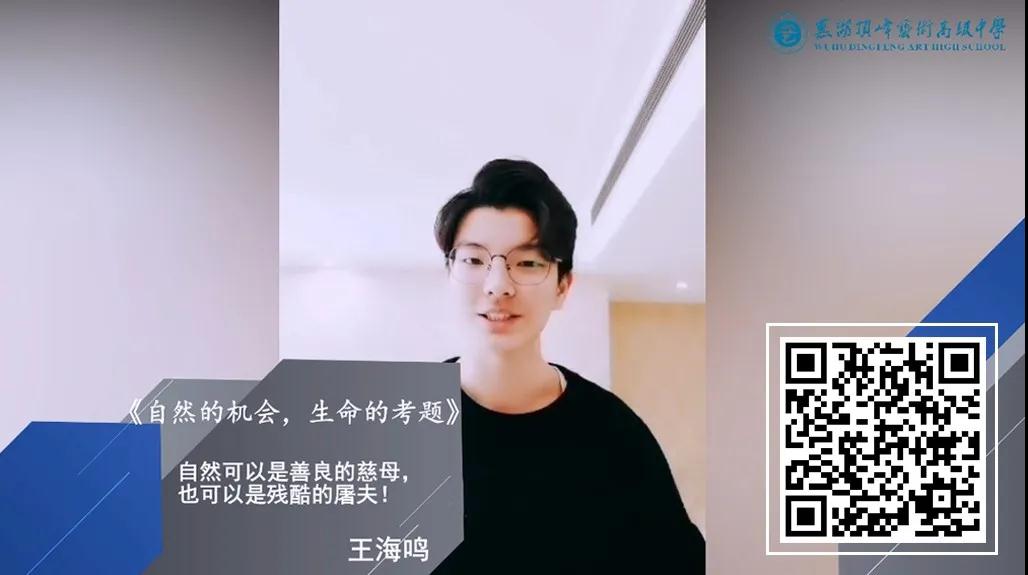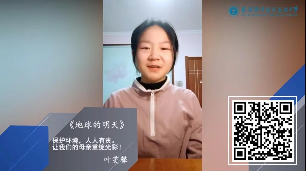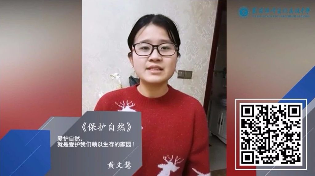 顶峰同学们通过观看纪录片《美丽中国》,感受生命活力,发现自然之美, 他们用视频记录下自己的感悟,为保护大自然作出一次精彩的亮相,展现出他们自信的精神面貌和积极向上的一面,同时也化身为一名环境保护的小使者,呼吁大家真正做到心存敬畏,行有所止,促进人与自然环境和谐共存和可持续发展! 【尊重自然,敬畏生命】 部分优秀演讲视频展示 黄文慧 高一(14)班 爱护自然,就是爱护我们赖以生存的家园! /识别图中二维码,观看黄文慧同学演讲视频 今天,我看了一部纪录片名叫《美丽中国》,美丽的自然景观引发了我的思考,大自然养育了我们,如果我们善待她,我们就会获得无穷无尽的资源;如果我们破坏她,大自然也会给我们带来危险,例如:2003年的非典和今年的肺炎。 雨果曾经说过:“大自然是善良的慈母,同时也是冷酷的屠夫。”保护环境就是保护人类本身,因此保护生态平衡是人类目前面对的重大问题! 国家也颁布了一系列法律来保护生态环境,而作为普通人的我们又能做一些什么呢?我不禁想到了我们的学校顶峰艺术高级中学。 顶峰有种植许多的古树名木,还养了孔雀、鸽子等动物,这不仅培养了浓郁的艺术氛围,还表现出了顶峰人对大自然的热爱,对生命的尊重。在顶峰,我常常看到同学们不乱扔垃圾,不乱踩草坪,这就是顶峰人对大自然热爱,对生命尊重的表现。 我们也会一直努力下去! 叶雯馨 高二(5)班 保护环境,人人有责。让我们的母亲重绽光彩! /识别图中二维码,观看叶雯馨同学演讲视频 徐思成 高三(2)班 保护环境,从我做起,从身边做起,从小事做起! /识别图中二维码,观看徐思成同学演讲视频 对于“环境问题”,你怎么看?首先,我的观点是,绿水青山就是金山银山。随着世界人民的生活水平和质量得到越来越大的提高,与此同时我们却忘记了地球母亲正在承载的那份“过重的压力”。环境问题一直是人们赖以生活的一个重要问题,而这个环境问题似乎被人们越来越淡之越来越忘却,近些年来不断的环境问题正警醒着人们,环境,真的很重要。从前几年的台风“山竹”,在台风过境的海滩上,人们看到了大量的海洋垃圾、塑料垃圾和电子废品。 台风过后,小小的环境污染只不过是对人类环境污染的一个警醒。与此同时我们可以看到,今年中国刚刚发生的“新冠肺炎”,和临边国家非洲的蝗灾,以及澳大利亚的火灾,南极北极的冰消雪融也正是因为全球气候升温而导致的很多北极熊无家可归,甚至没有食物可以再去吃了… 这种种的环境问题都在不断的警醒着人们该去好好的保护环境,去爱护环境了。地球母亲一直是我们伟大的母亲,我们只顾着一味地索取,那可是不行的。而如今地球母亲给了我们一些个小小的惩罚,这些惩罚就应该更加的警醒我们,去爱护环境保护环境。可能说大的保护环境离我们太远了,但是我们可以从身边做起,从一点一滴做起。所谓铁杵磨成针,我相信我们每一个人动起手来,就能守卫好,保护好我们的环境。 宋苗苗 高三(3)班 当我们从大自然的角度来观察这个世界时,才能看清这个世界与形态的面貌! /识别图中二维码,观看宋苗苗同学演讲视频 观看纪录片《美丽中国》首先映入眼帘的便是雪山,草原,湖泊,大海,一切都美得令人窒息。机灵可爱的金丝猴,憨态可掬的大熊猫,这些如此丰富的多样性实在令人叹为观止。 整部片子的背景音乐、画面,远离的现代城市的浮华,把镜头瞄准了自然中的生物,从它们身上表现出中国几千年根深蒂固的淳朴与天人合一,人与自然和谐生活的理念。 因为现代都市的人与生活中,中国的特质已经被湮灭了。无污染无破坏的自然环境本是来自然界中最美好、最观壮景的景象,但人类无止境开发建设却把这些美好破坏殆尽。物种濒临灭绝,而美丽的自然不复存在,最终也影响到了我们的生活。当我们从大自然的角度来观察这个世界时,才能看清这个世界与形态的面貌。以展现真实为本质,并用真实引发人们思考。 那么可能很多人会觉得保护大自然好像是一个很困难的事情 ,但其实,大自然就是由我们身边的一草一木,一鸟一石所组建起来的。那么在我们的学校中,像孔雀,古树,银杏包括枫叶还有我们学校的湖水,这些其实也是属于大自然中的一部分。如果我们在学校中能够保护好这些自然植被的话,那么其实也是为保护大自然贡献了自己的一份力量。如今,可持续发展,绿色发展已经成为国家政策,那么这些也是我们作为学生义不容辞的责任。所以,保护大自然不在于你能贡献多少,而在于你愿不愿意去做?最后,让我们携手保护大自然,为保护大自然贡献出自己的一份力量! 王海鸣 高三(4)班 自然可以是善良的慈母,也可以是残酷的屠夫! /识别图中二维码,观看王海鸣同学演讲视频 观看完纪录片《美丽中国》让我不禁想到,在人类历史的发展进程中,在农耕时代,人们从土地当中竭取最直接的生命来源,而当一个人生命结束之后,又将自己的全身心归还给土地,其实,这就是达成了人类与自然之间的一种平衡,而那样的日子,也是我们现代人最为追求的草长莺飞、鸟语花香的日子。 但是随着时代的进步、科技的发展,人们的生活越来越便利,人们的野心也在愈发膨胀,甚至有人提出了“人定胜天”这个思想。他们不满足于自然界的束缚,想要去探索更大、更远的世界,其实,这样的想法本身没有错,但是他们的行为,