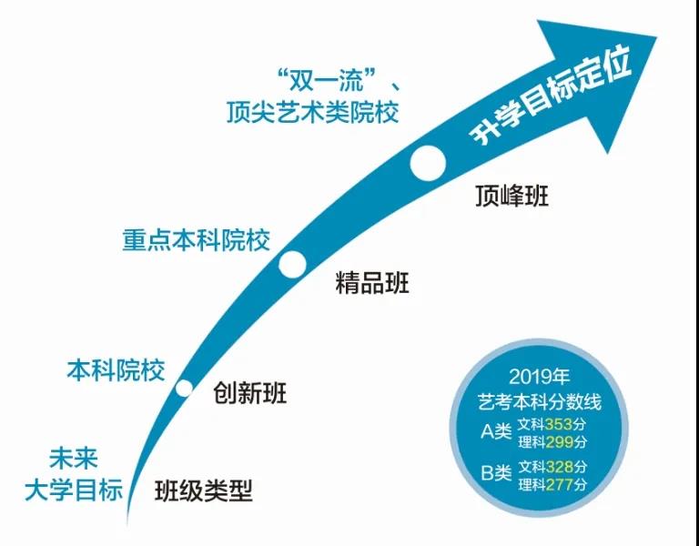 “因材施教,有教无类”,尊重每一个孩子的特点,实行“个性化定向培养模式”,给孩子创造多层次的升学选择。我校针对文化课基础不同层次的学生,结合他们的兴趣艺术特长,量体裁衣,通过三年的文化课和专业课系统化培养,最终实现“低进高出,高进优出”的培养目标。