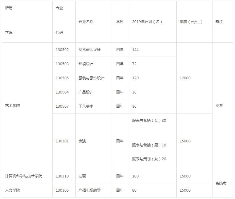 其中设计学类专业、表演专业组织专业校考,面向全国招生,不编制分省计划。广播电视编导、动画专业不组织专业校考,省统考成绩合格,按我校规定的录取原则录取,仅在部分省市编制计划,分省计划于2019年6月经天津市教委审核通过后向社会公布。