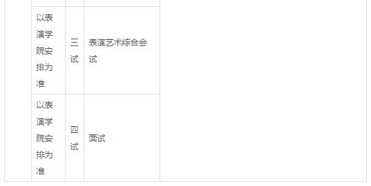 注意事项:报考表演专业的考生,参加专业考试时:一律不许化妆,严禁穿着增高鞋,使用增高垫;进入三试参加专业考试时请自备形体练功服、平跟软底鞋。戏剧影视表演专业,初试进入复试合格线依据表演学院划定的合格线为准;复试进入三试的合格线依据高等职业教育学院划定的合格线为准。进入高等职业教育学院三试的考生,需要参加高等职业教育学院组织的三试考试。